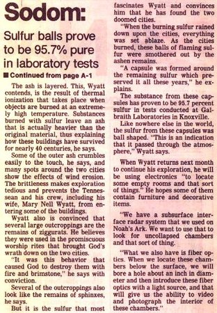 Neben den erwähnten Überresten findet man hier auch Millionen von Schwefelkügelchen, die nicht vollständig verbrannten. Die Zusammensetzung dieser Kügelchen mutet fast unglaublich an. Es handelt sich hierbei praktisch um reinen Schwefel (>95%), mit einer geringen Menge an Spurenelementen. Die in den Schwefelkügelchen enthaltene geringe Magnesium-Beimischung erhöht die Brenntemperatur des Schwefels. Diese Brenntemperatur liegt somit bei über 4000 °F (2200 °C). Ron Wyatt zündete ein Stück dieses Schwefels auf einem Teelöffel aus Edelstahl an, doch der Edelstahl wurde durch den brennenden Schwefel in keiner Weise beschädigt (Edelstahl oxidiert nicht eben leicht :-) ).