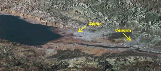 Wir finden in der Bibel noch weitere präzisierende Angaben bezüglich der Anzahl dieser Städte und der geografischen Lage von Sodom, Gomorra und anderen zerstörten Ortschaften: Genesis 14,2-3 , Genesis 14,8 , 1. Samuel 13,18 , Genesis 14,10 , Hosea 11,8 , Jeremia 50,40. Aufgrund dieser Informationen kann geschlossen werden, dass mindestens vier Städte im Jordantal – Sodo, Gomorra, Adma und Zebojim – zerstört wurden. Und zerstört werden sollte auch Zoar (Bela), aber um Lots willen wurde dieser Ort verschont (Genesis 19,19-23).